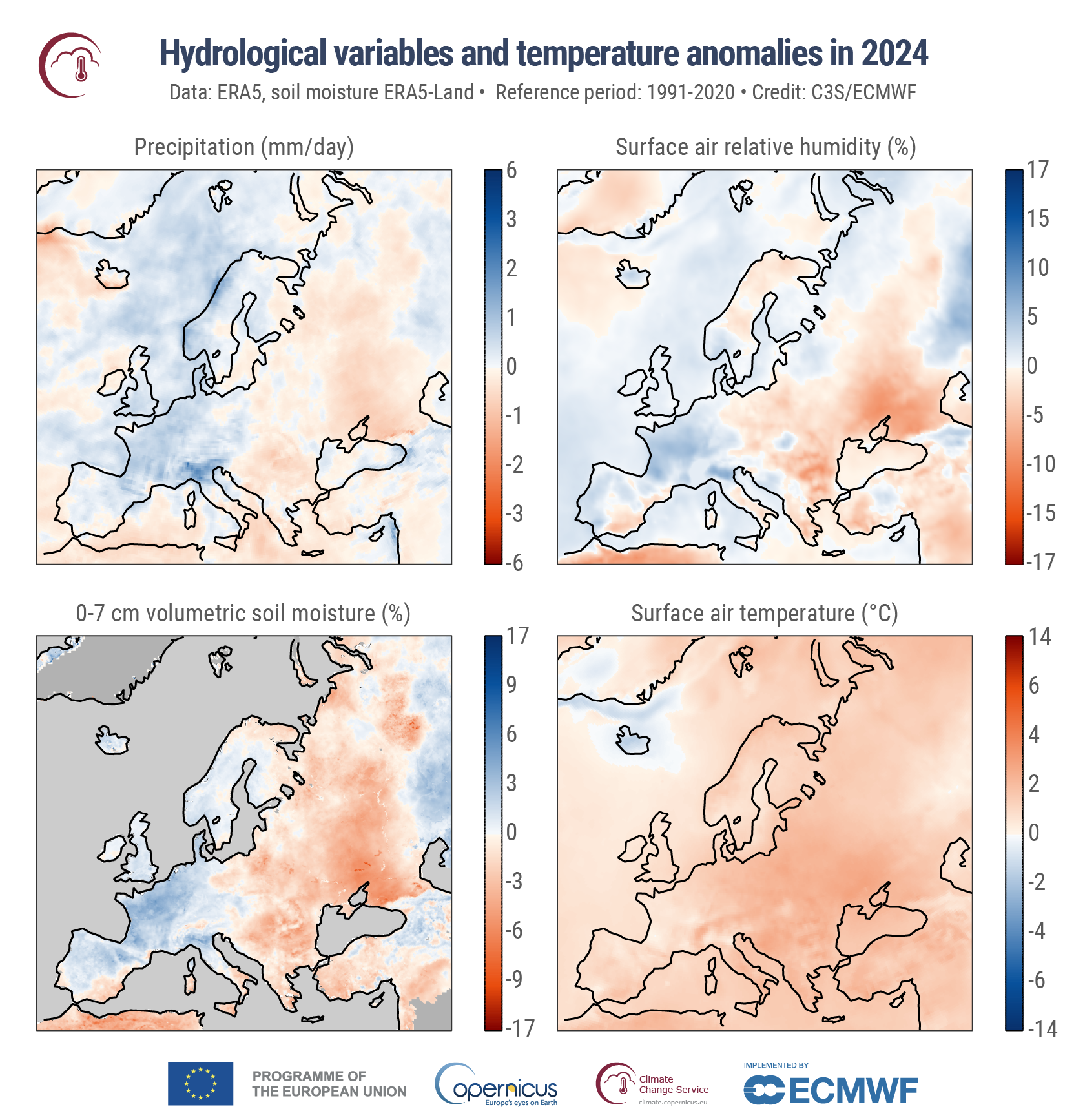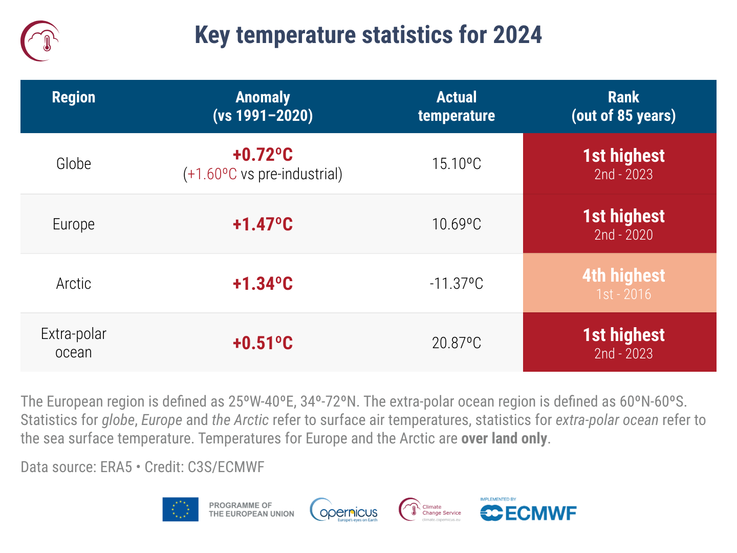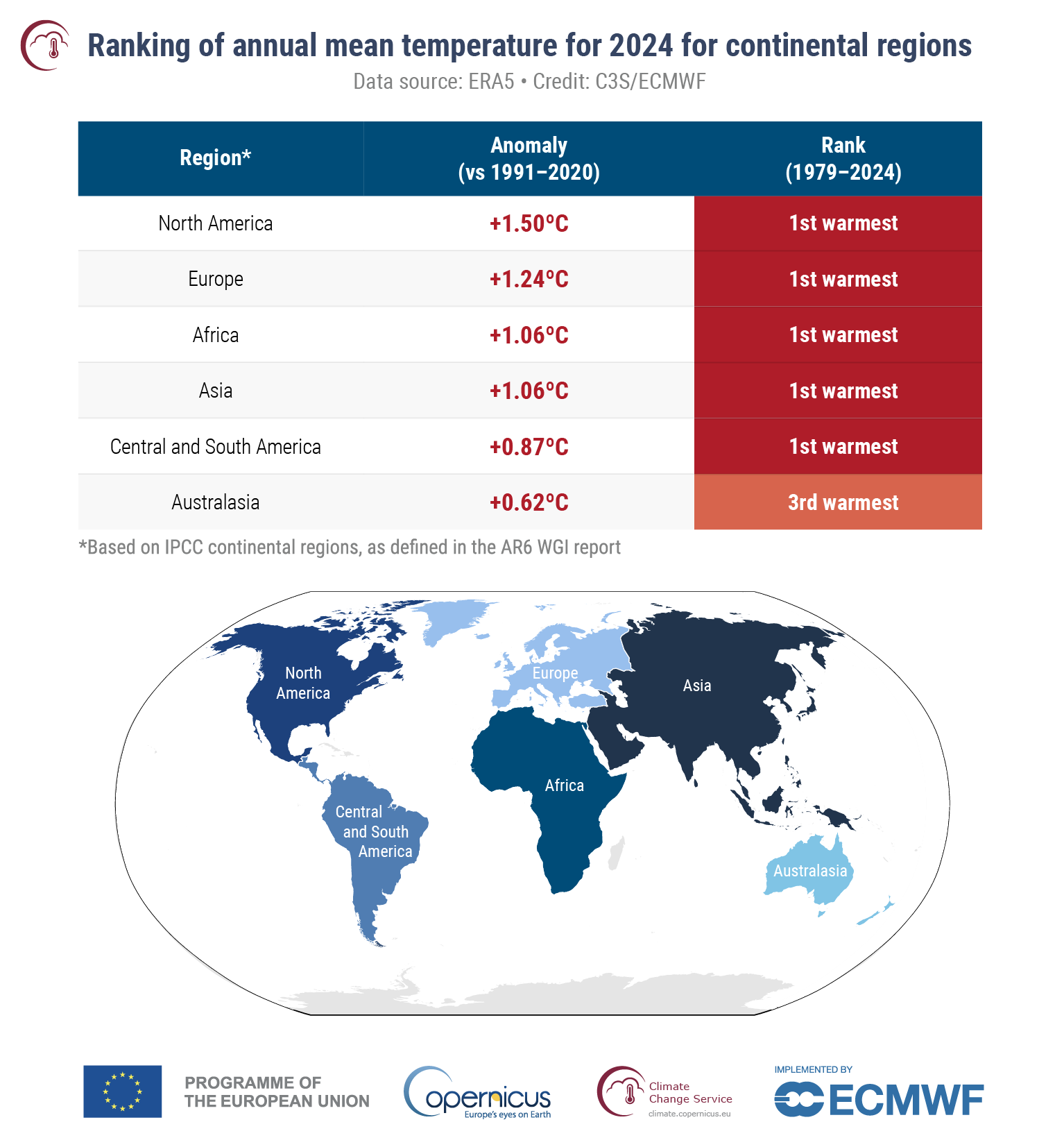 Europa verzeichnete mit 10,69°C das wärmste Jahr seiner Geschichte. Besonders Frühling und Sommer 2024 erreichten neue Rekorde. Zentral- und Osteuropa waren von den höchsten Anomalien betroffen.