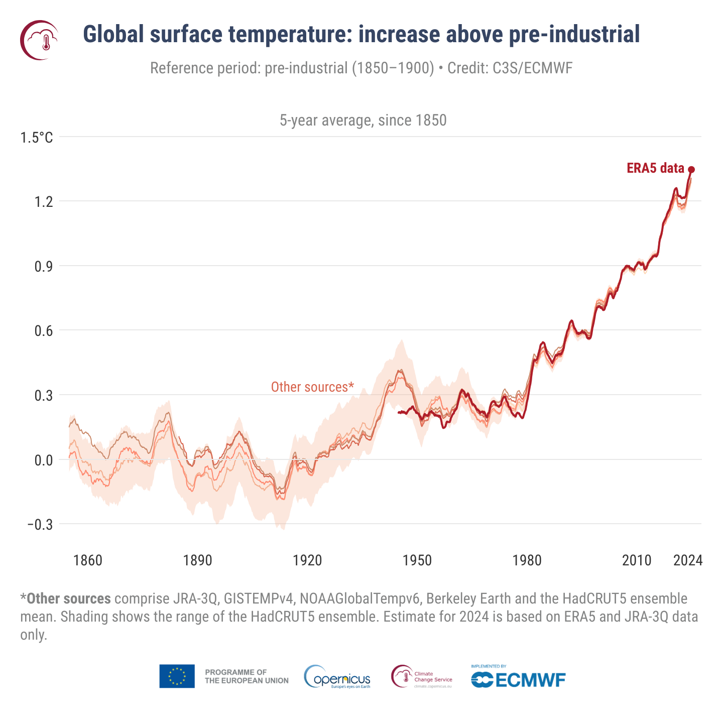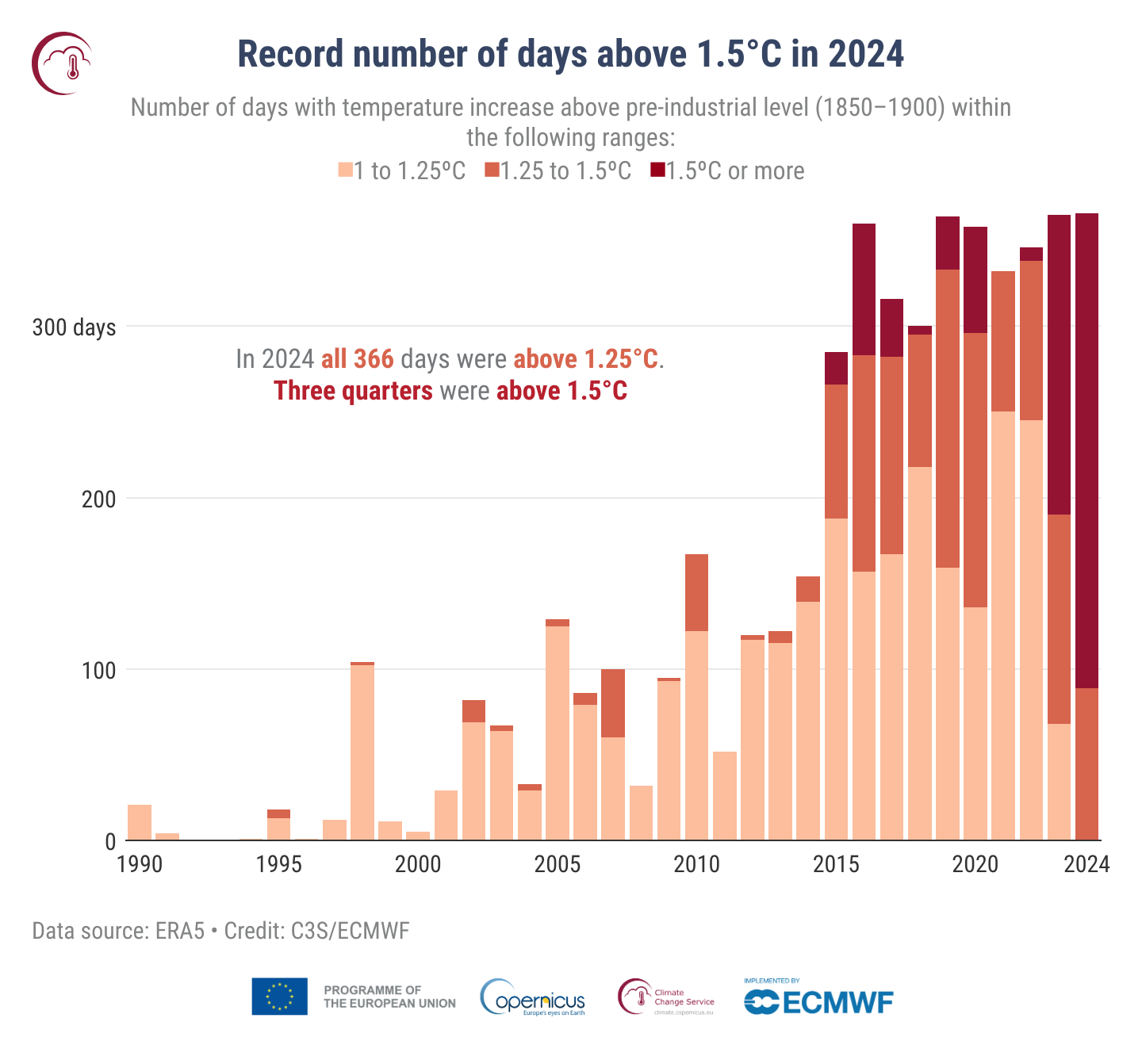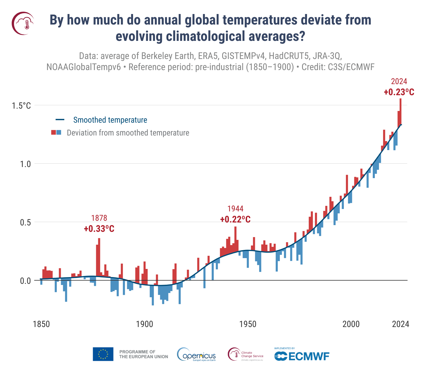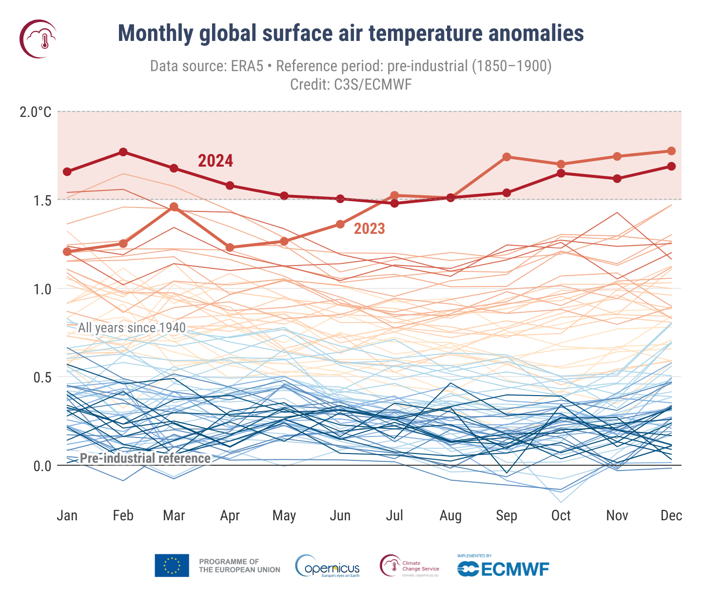 Das Jahr 2024 war das wärmste Jahr seit Beginn der Temperaturaufzeichnungen im Jahr 1850 und das erste Jahr, in dem die durchschnittliche globale Oberflächentemperatur 1,5°C über dem vorindustriellen Niveau lag. Dies stellt eine bedeutende Schwelle dar, die im Pariser Abkommen definiert wurde, um die Risiken des Klimawandels zu begrenzen.