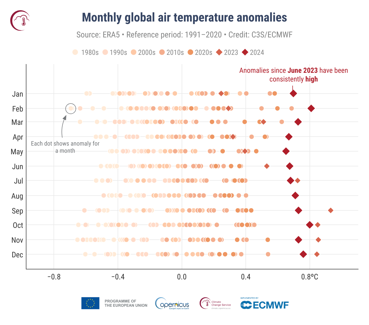 - Elf der zwölf Monate des Jahres 2024 lagen über dem Schwellenwert von 1,5°C.
