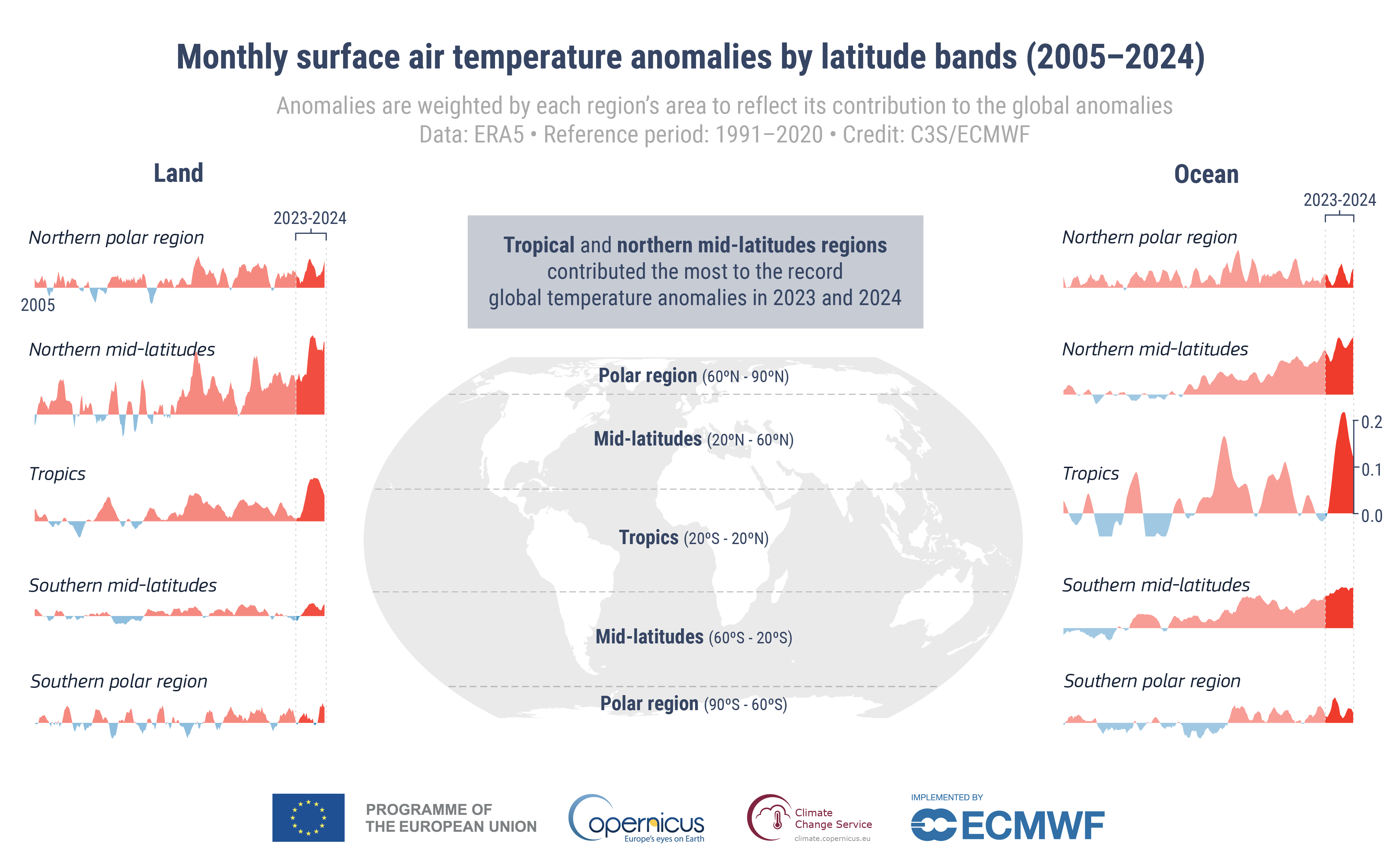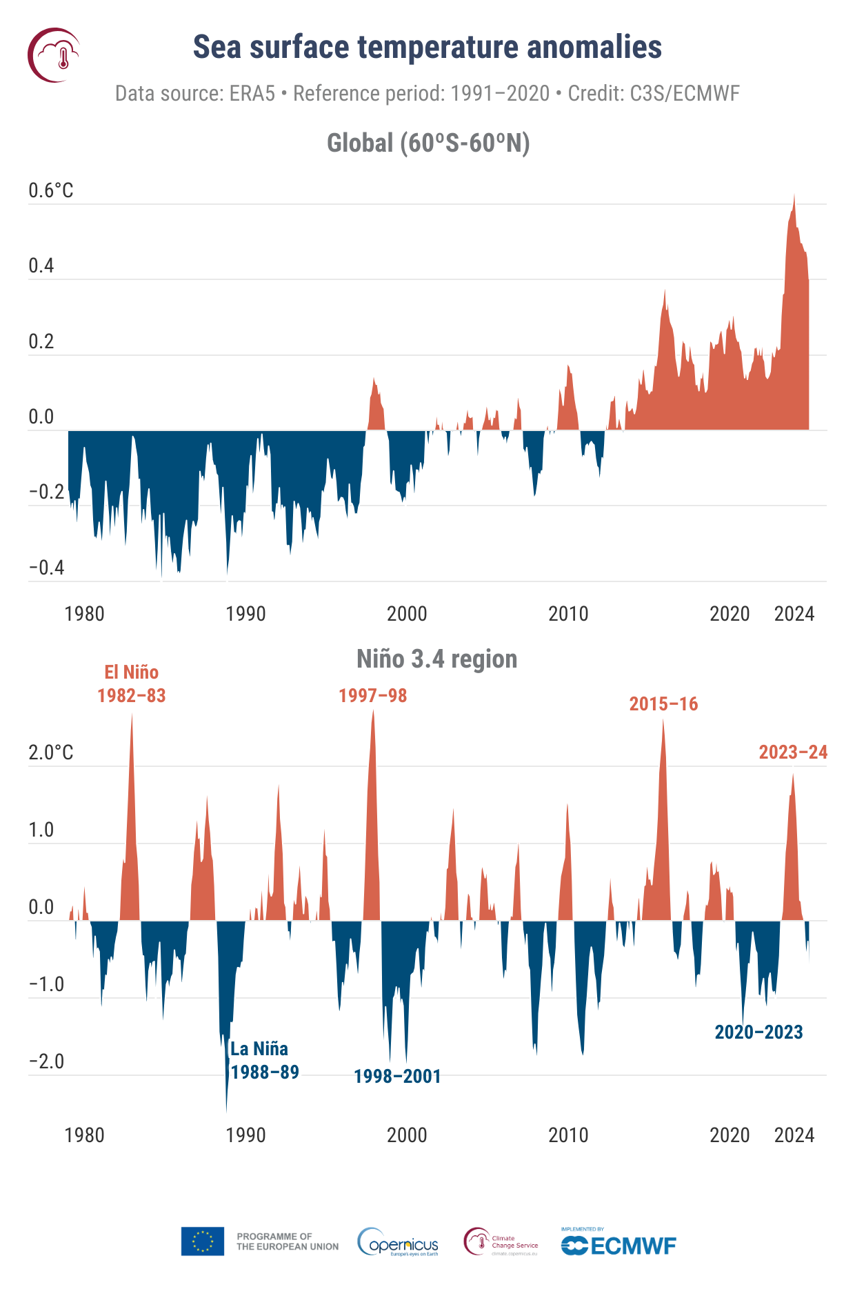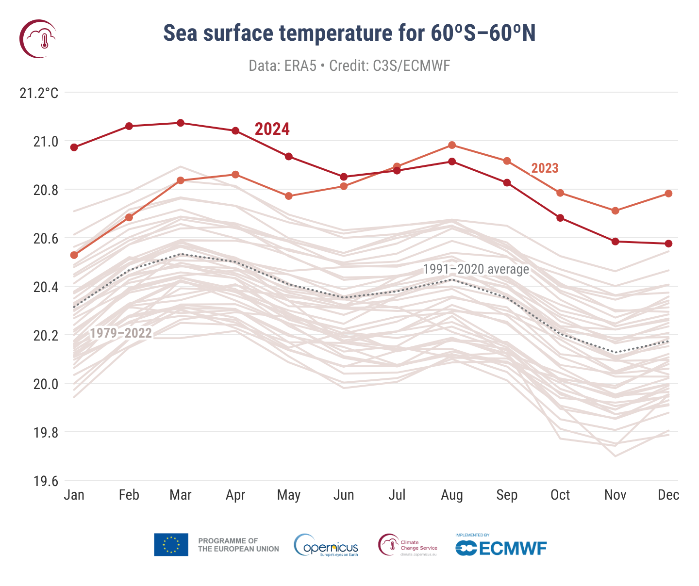 Die durchschnittliche Meeresoberflächentemperatur erreichte mit 20,87°C einen neuen Höchststand. Dieser Anstieg war stark durch das El-Niño-Phänomen beeinflusst, das die globale Wärme weiter verstärkte. Gleichzeitig trugen Rekordtemperaturen in mehreren Ozeanbecken zu marinen Hitzewellen bei, die ökologische Systeme, wie Korallenriffe, massiv beeinträchtigten.