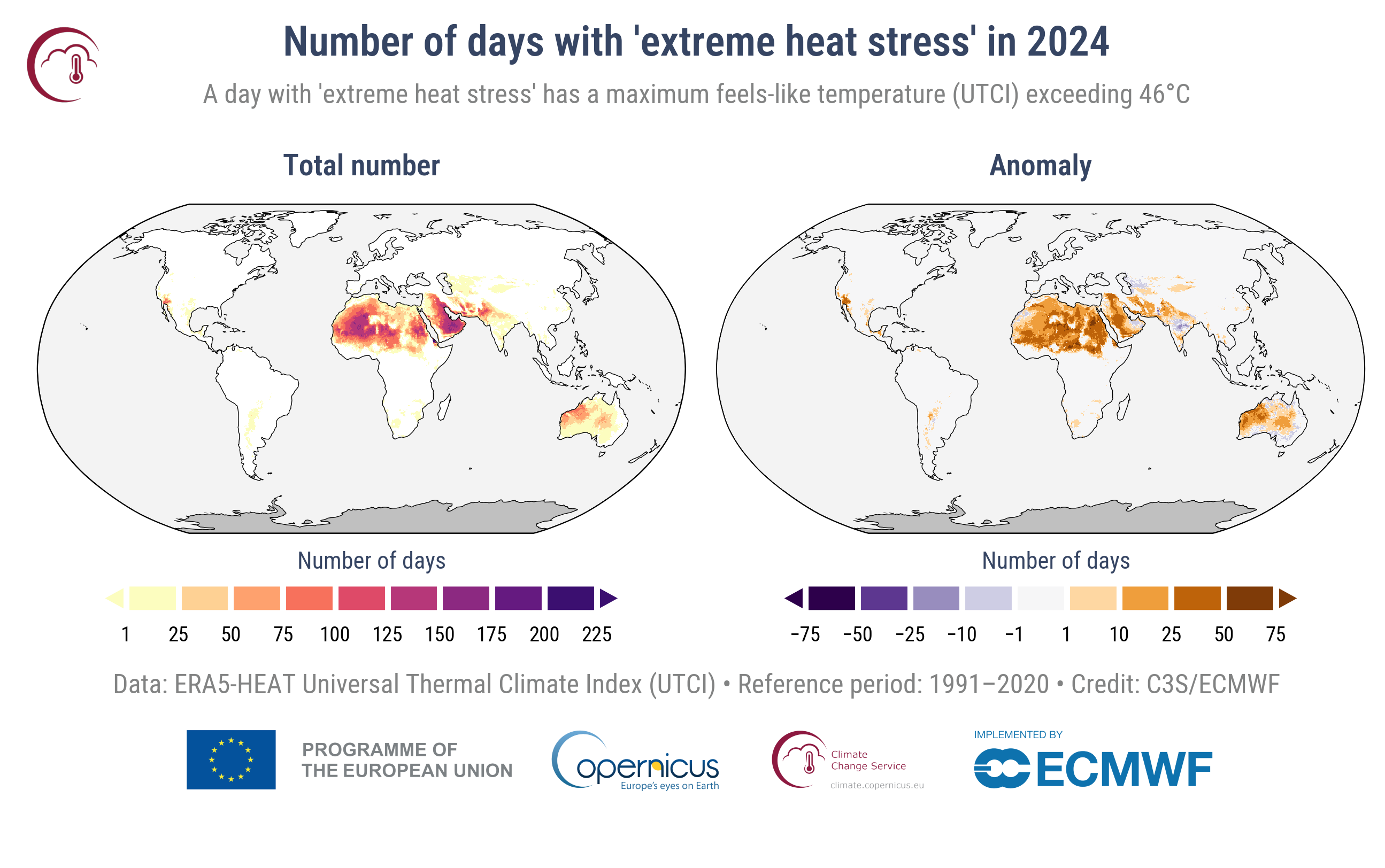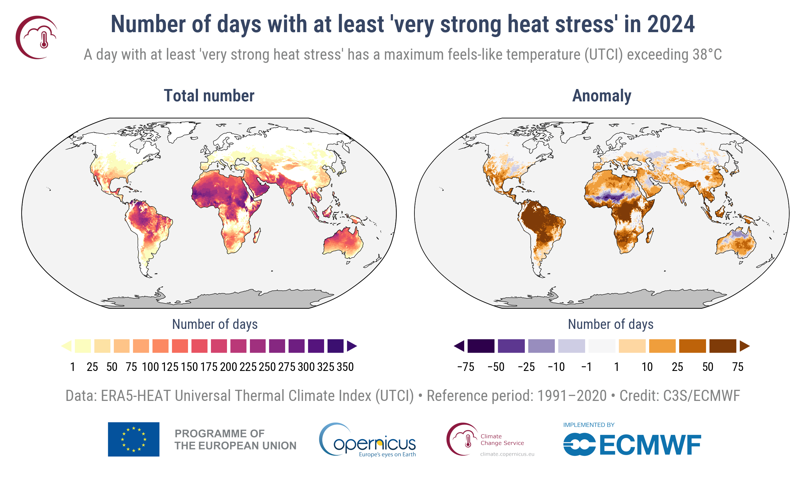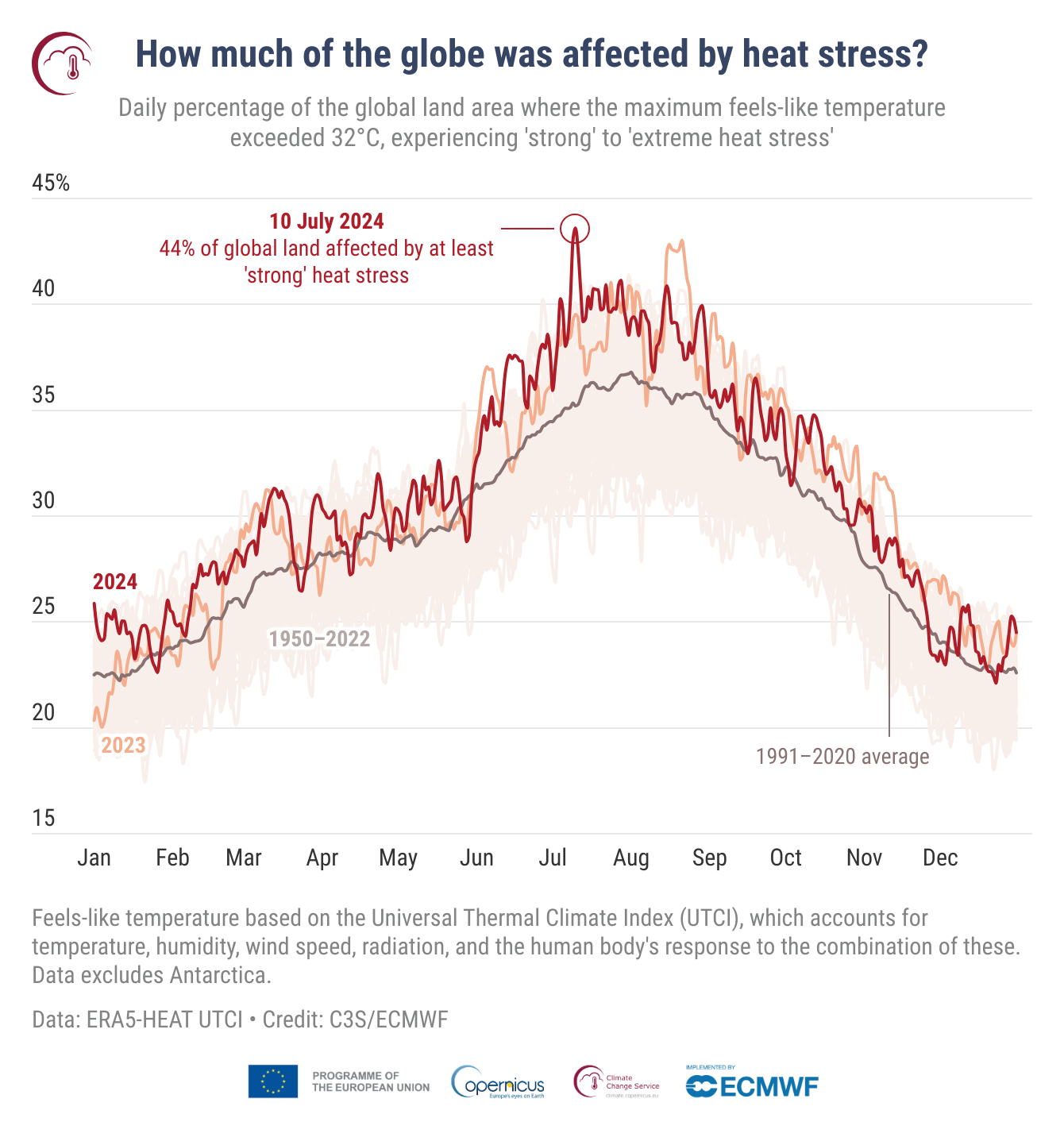 Die Ausdehnung von Regionen mit mindestens „starkem Hitzestress“ erreichte ein neues Maximum. Am 10. Juli 2024 waren 44% der Erdoberfläche von starkem bis extremem Hitzestress betroffen, ein Anstieg von 5% gegenüber dem bisherigen Durchschnittswert.